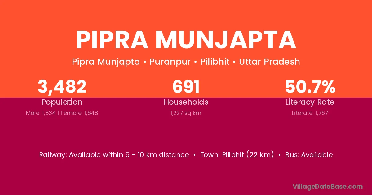 Pilibhit (22 km) is the nearest town to Pipra Munjapta village for major economic activities and is located approximately 22 km away.