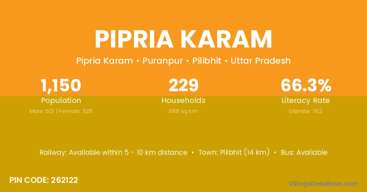 Pilibhit (14 km) is the nearest town to Pipria Karam village for major economic activities and is located approximately 14 km away.