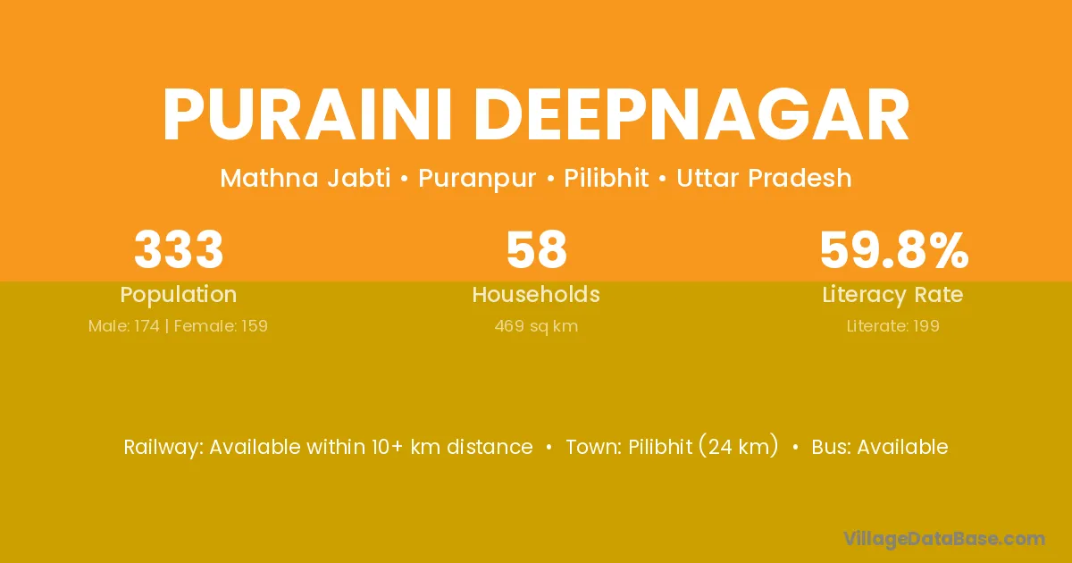 Pilibhit (24 km) is the nearest town to Puraini Deepnagar village for major economic activities and is located approximately 24 km away.