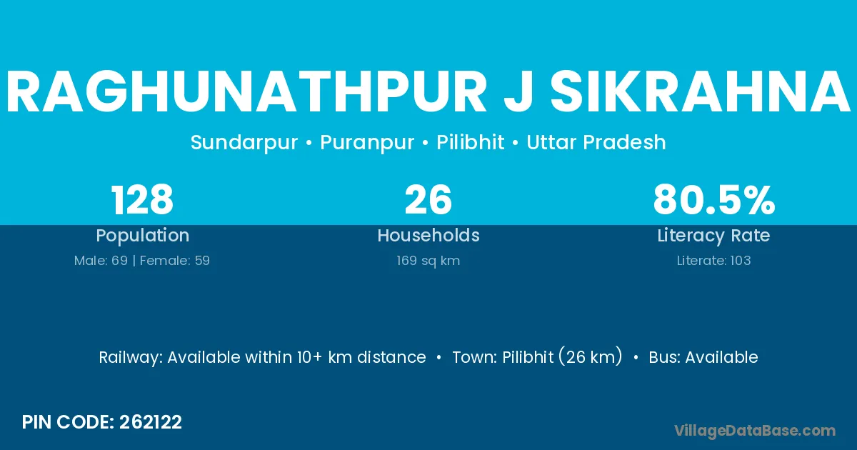 Pilibhit (26 km) is the nearest town to Raghunathpur J Sikrahna village for major economic activities and is located approximately 26 km away.