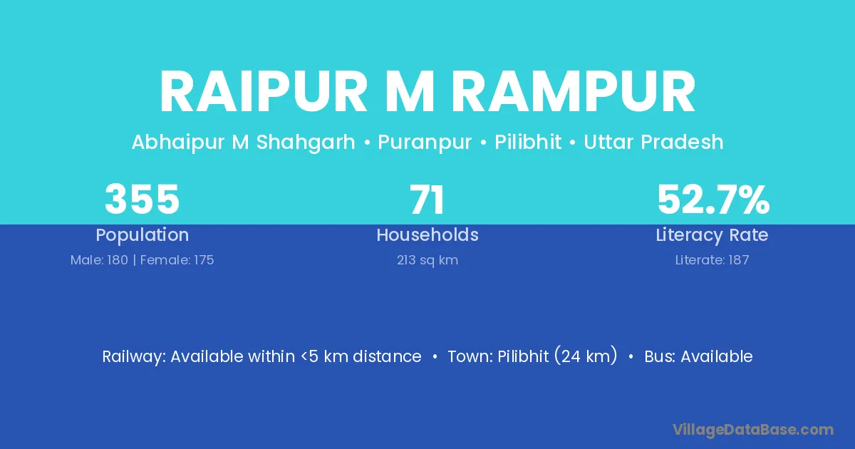 Pilibhit (24 km) is the nearest town to Raipur M Rampur village for major economic activities and is located approximately 24 km away.