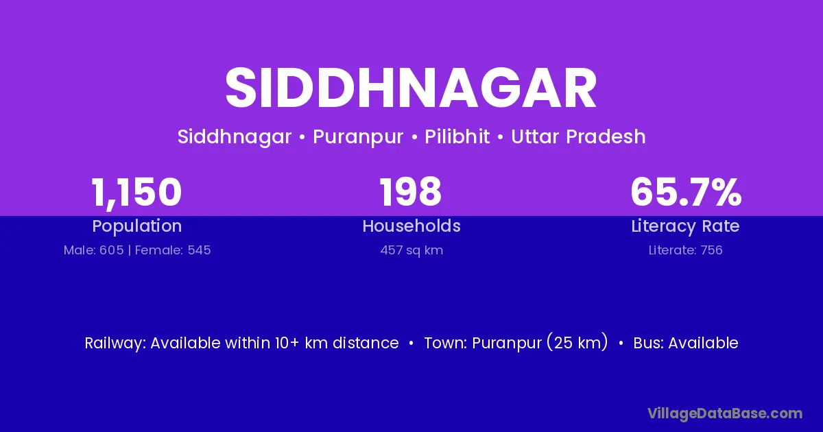 Puranpur (25 km) is the nearest town to Siddhnagar village for major economic activities and is located approximately 25 km away.