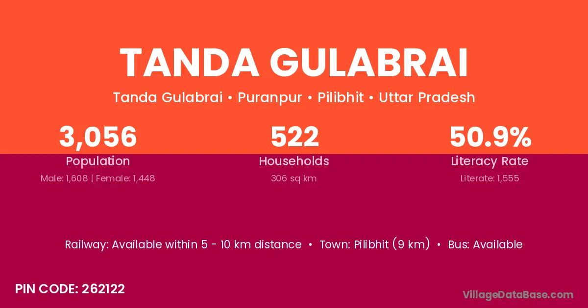Pilibhit (9 km) is the nearest town to Tanda Gulabrai village for major economic activities and is located approximately 9 km away.