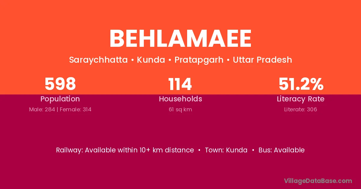 Behlamaee village has a total population of 598 people, of which 284 are males and 314 are females.