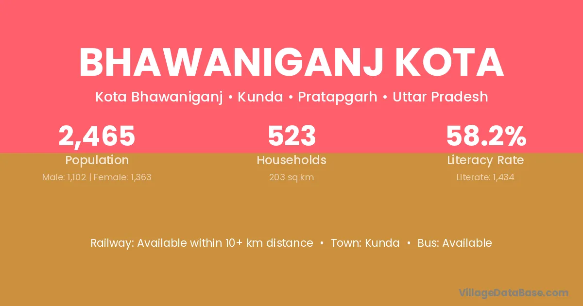 Bhawaniganj Kota village has a total population of 2,465 people, of which 1,102 are males and 1,363 are females.