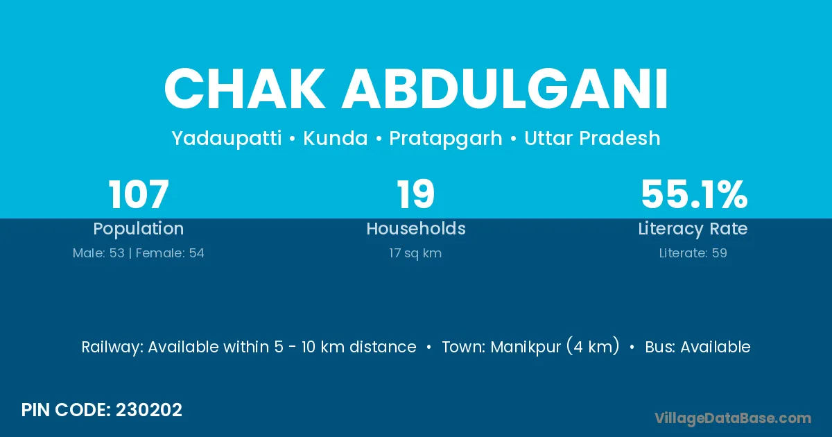 Chak Abdulgani village has a total population of 107 people, of which 53 are males and 54 are females.