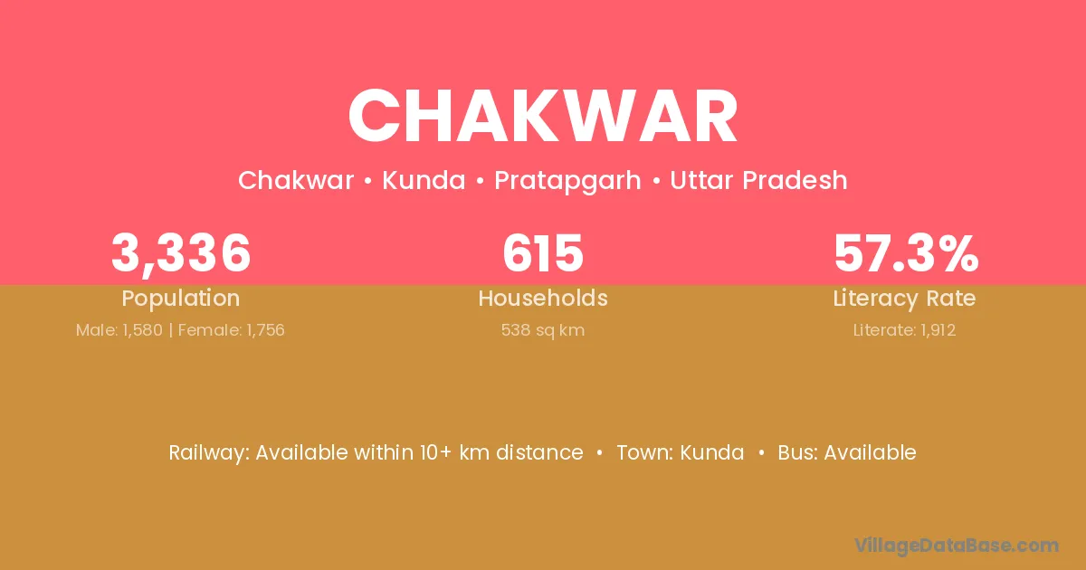 Chakwar village has a total population of 3,336 people, of which 1,580 are males and 1,756 are females.
