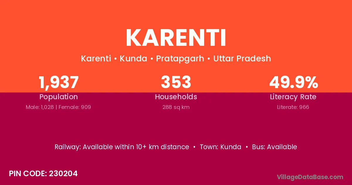 Karenti village has a total population of 1,937 people, of which 1,028 are males and 909 are females.