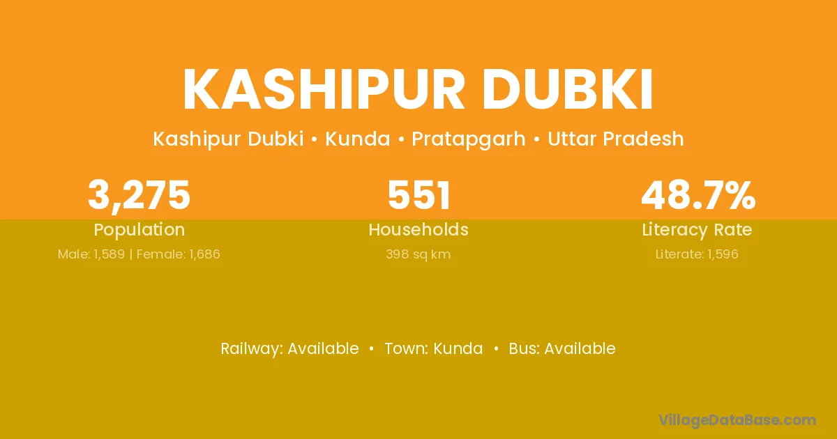 Kashipur Dubki village has a total population of 3,275 people, of which 1,589 are males and 1,686 are females.