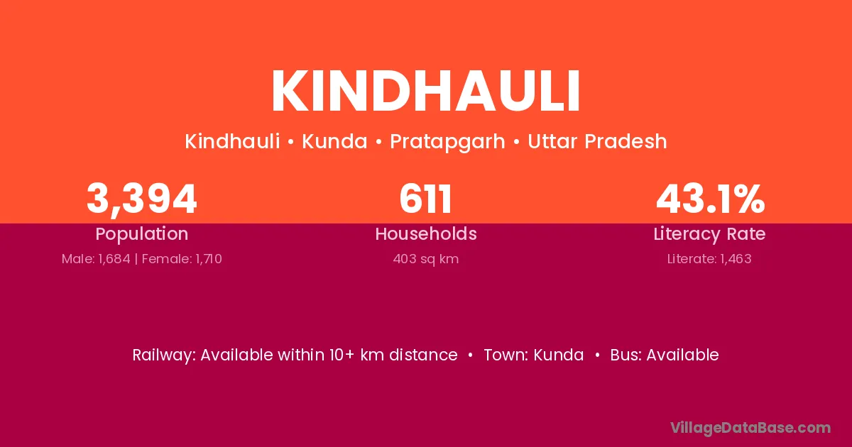 Kindhauli village has a total population of 3,394 people, of which 1,684 are males and 1,710 are females.