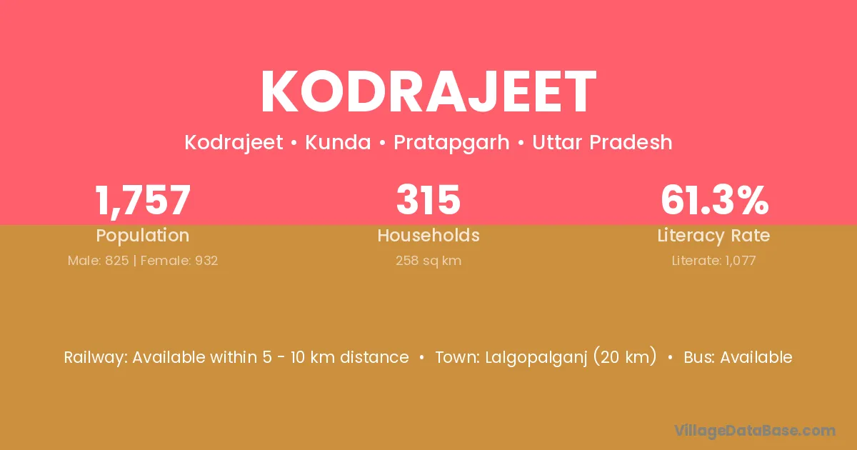 Lalgopalganj (20 km) is the nearest town to Kodrajeet village for major economic activities and is located approximately 20 km away.