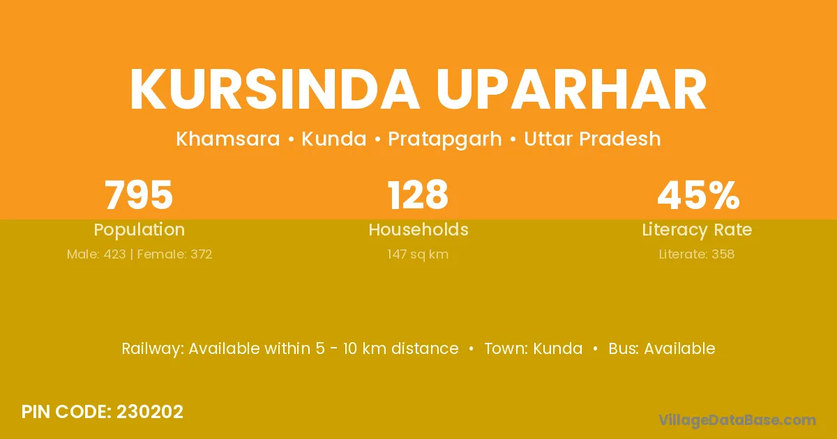 Kursinda Uparhar village has a total population of 795 people, of which 423 are males and 372 are females.