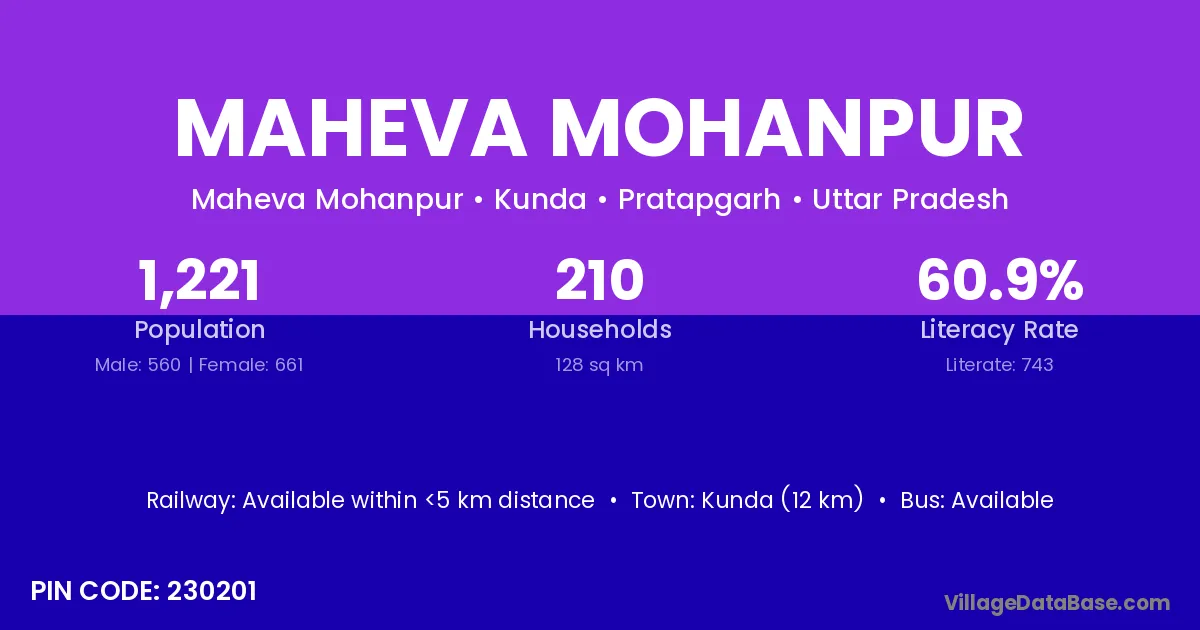 Kunda (12 km) is the nearest town to Maheva Mohanpur village for major economic activities and is located approximately 12 km away.