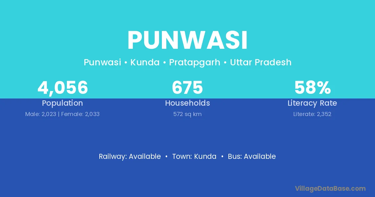 Punwasi village has a total population of 4,056 people, of which 2,023 are males and 2,033 are females.