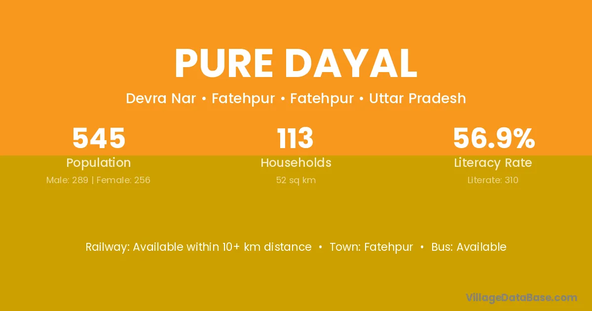 The literacy rate of Pure Dayal village is 60.76%. Male literacy stands at 69.00% and female literacy at 54.74%.