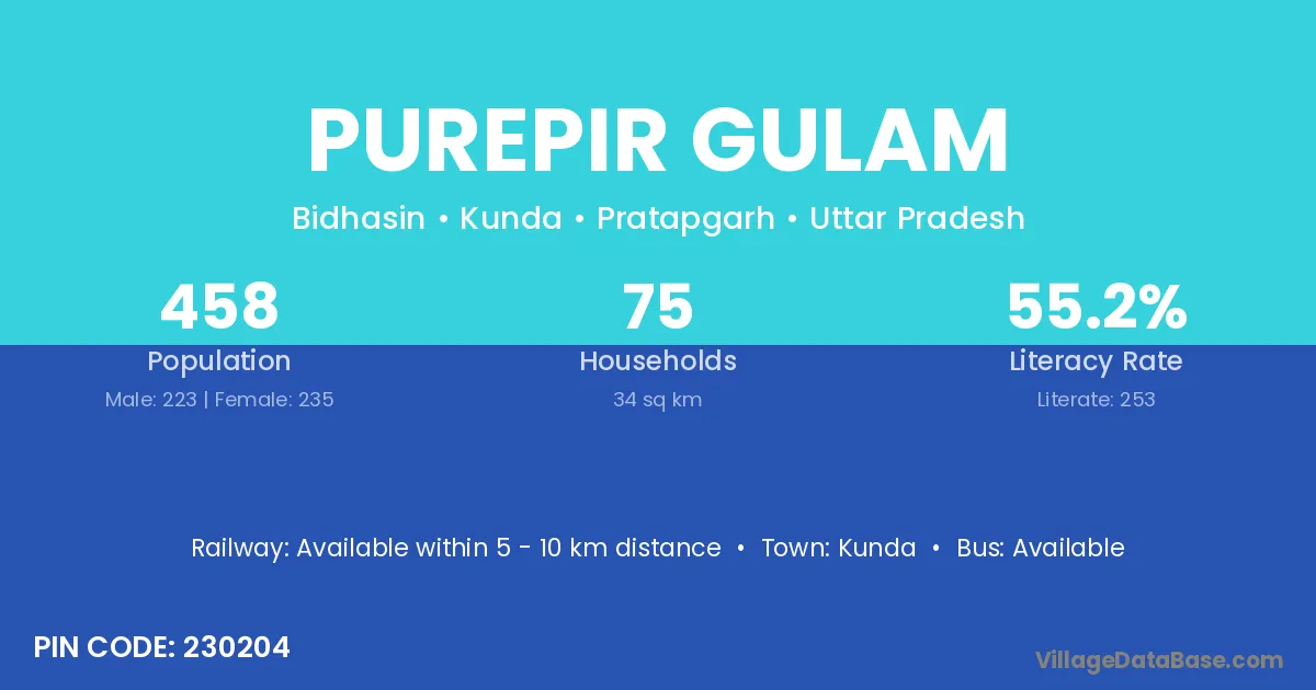 Purepir Gulam village has a total population of 458 people, of which 223 are males and 235 are females.