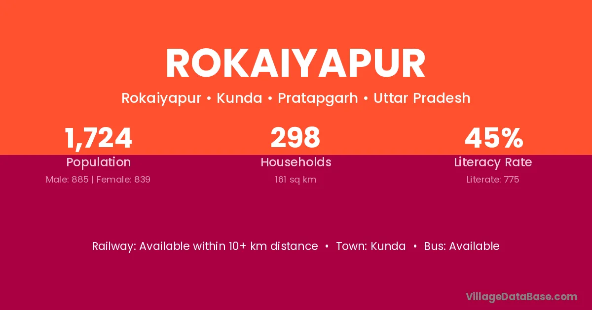 Rokaiyapur village has a total population of 1,724 people, of which 885 are males and 839 are females.