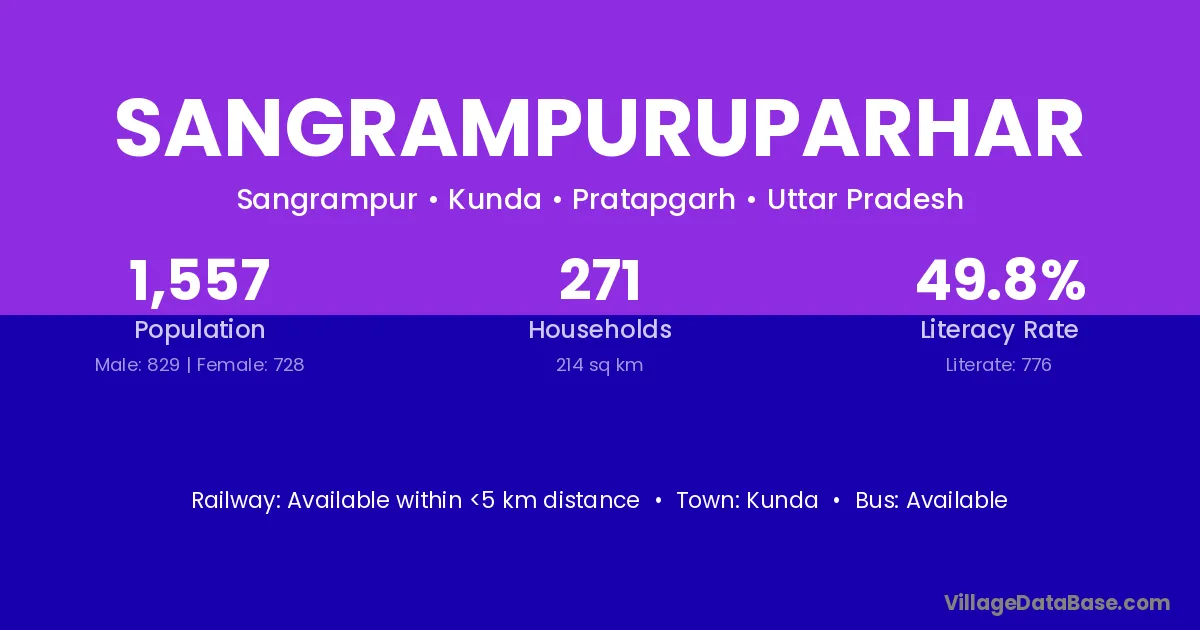 Sangrampuruparhar village has a total population of 1,557 people, of which 829 are males and 728 are females.