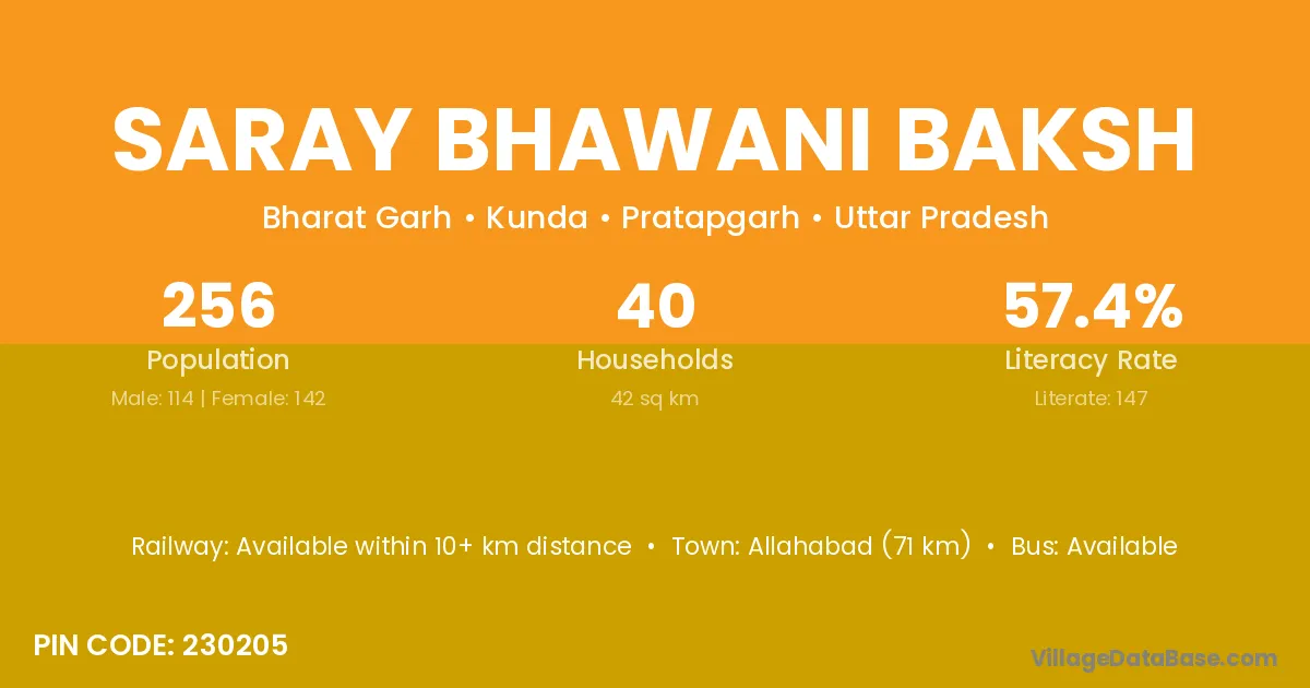 Allahabad (71 km) is the nearest town to Saray Bhawani Baksh village for major economic activities and is located approximately 71 km away.