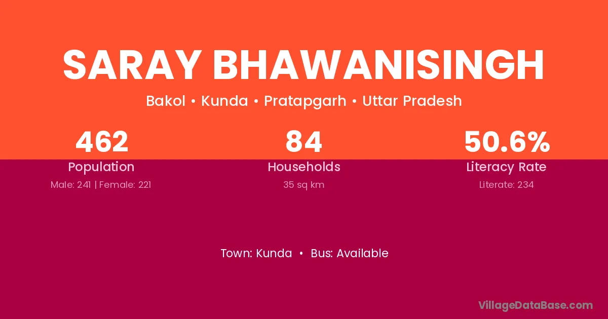 Saray Bhawanisingh village has a total population of 462 people, of which 241 are males and 221 are females.