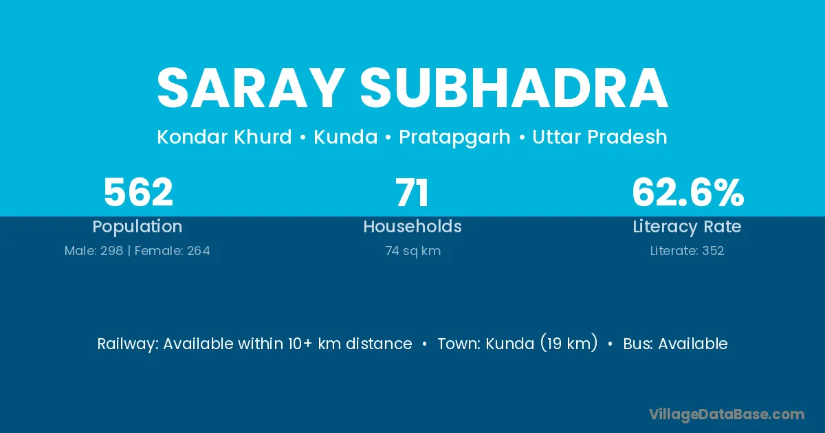 Kunda (19 km) is the nearest town to Saray Subhadra village for major economic activities and is located approximately 19 km away.