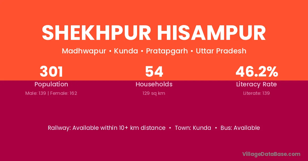Shekhpur Hisampur village has a total population of 301 people, of which 139 are males and 162 are females.