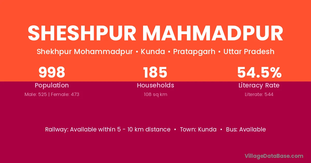 Sheshpur Mahmadpur village has a total population of 998 people, of which 525 are males and 473 are females.