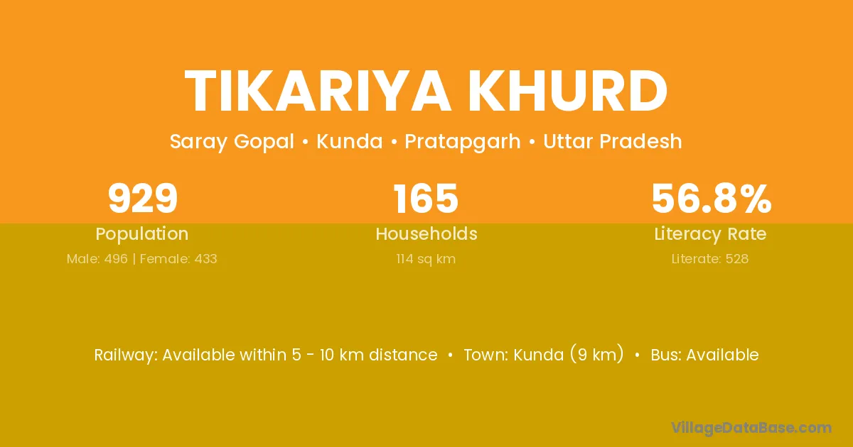 Tikariya Khurd village has a total population of 929 people, of which 496 are males and 433 are females.