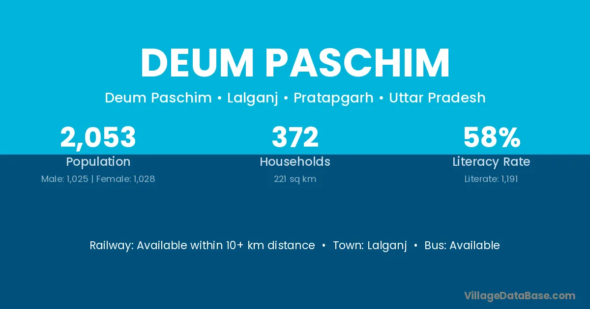 Deum Paschim village has a total population of 2,053 people, of which 1,025 are males and 1,028 are females.