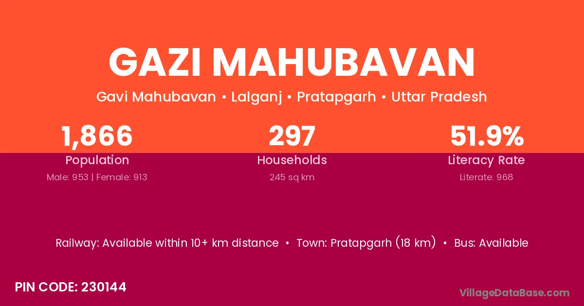 Pratapgarh (18 km) is the nearest town to Gazi Mahubavan village for major economic activities and is located approximately 18 km away.