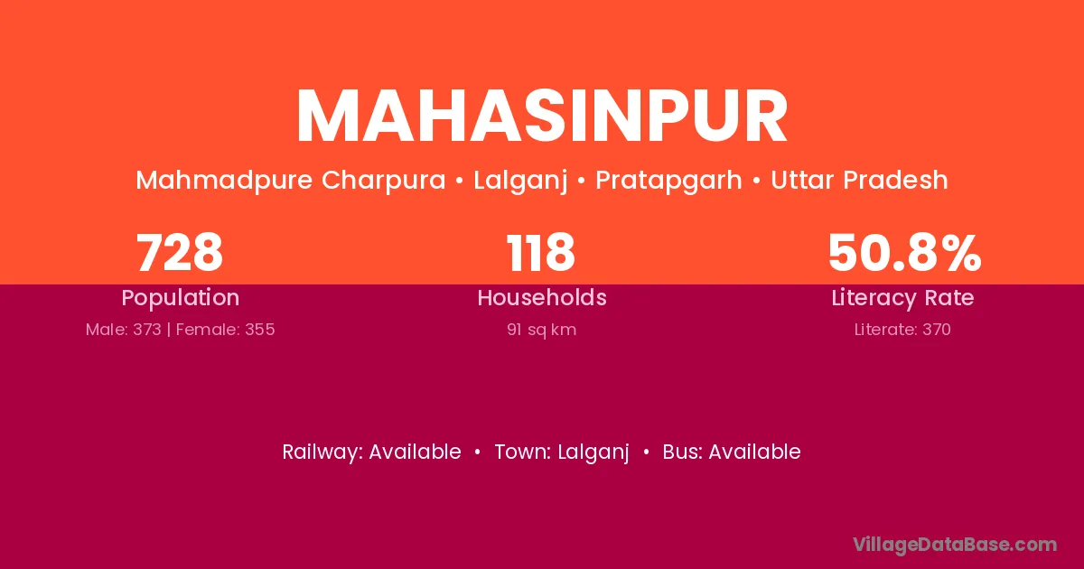 Mahasinpur village has a total population of 728 people, of which 373 are males and 355 are females.
