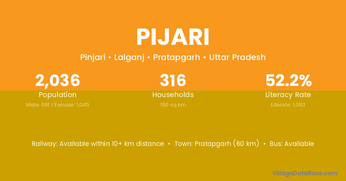 Pratapgarh (60 km) is the nearest town to Pijari village for major economic activities and is located approximately 60 km away.