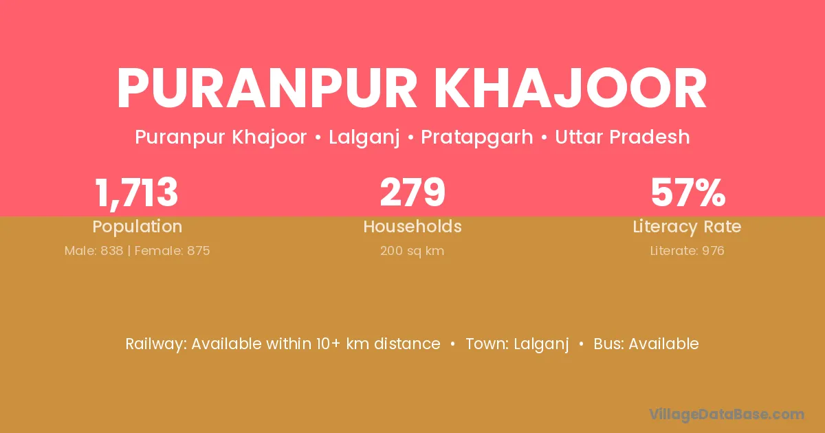 Puranpur Khajoor village has a total population of 1,713 people, of which 838 are males and 875 are females.