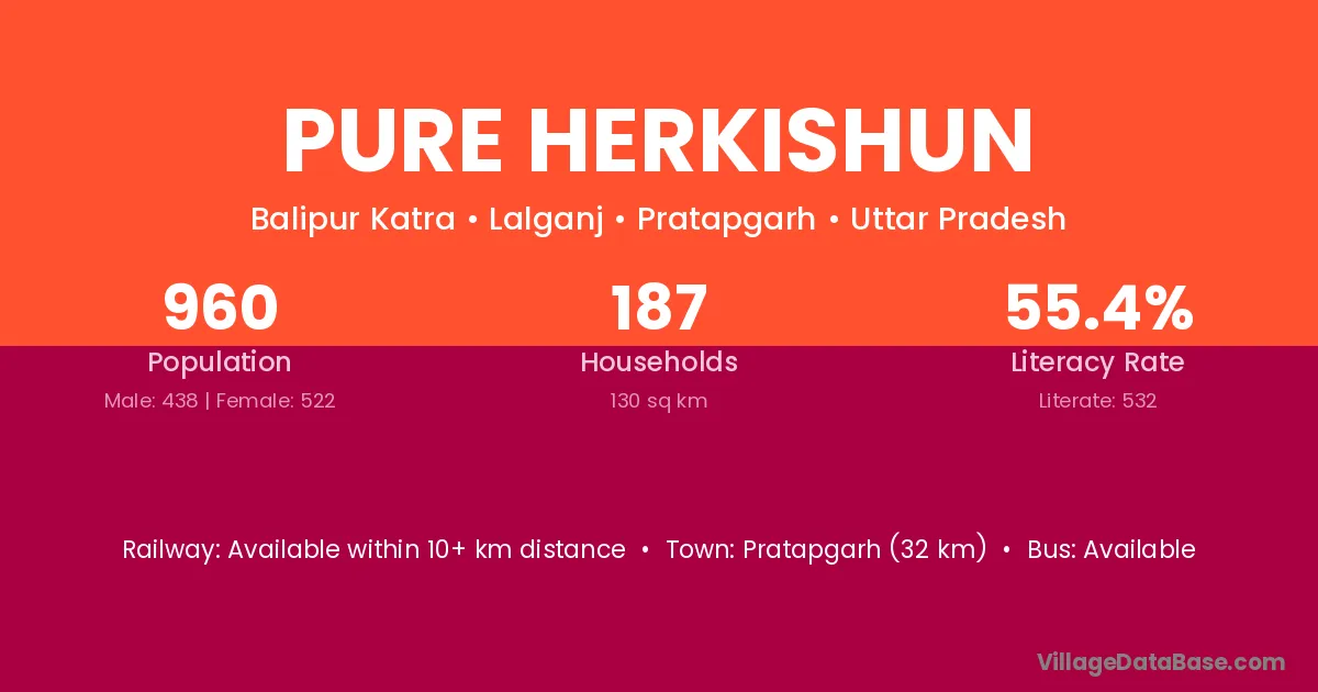 Pratapgarh (32 km) is the nearest town to Pure Herkishun village for major economic activities and is located approximately 32 km away.