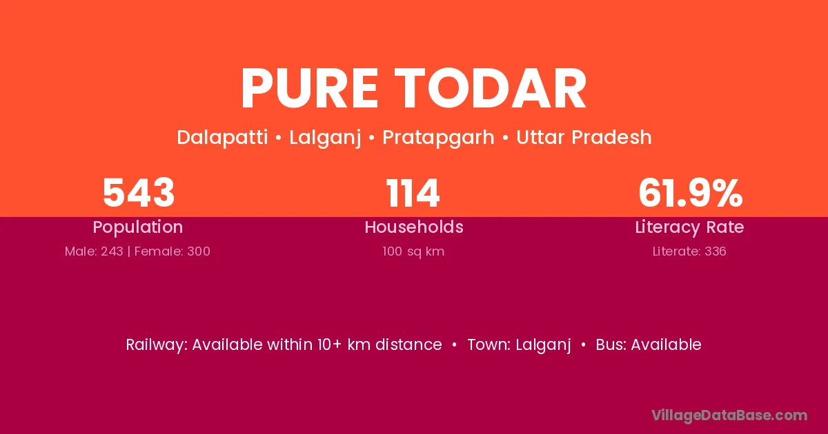 The literacy rate of Pure Todar village is 61.88%. Male literacy stands at 73.25% and female literacy at 52.67%.