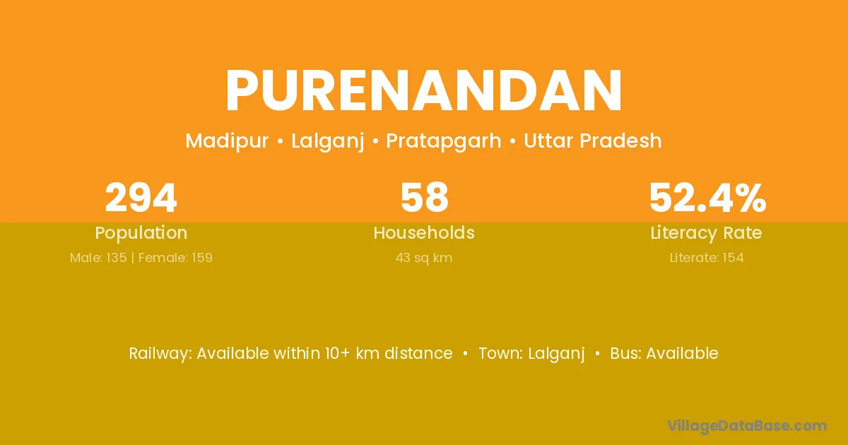 Purenandan village has a total population of 294 people, of which 135 are males and 159 are females.