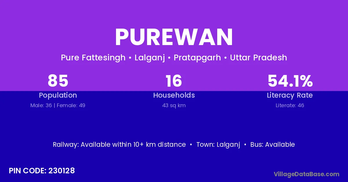 Purewan village has a total population of 85 people, of which 36 are males and 49 are females.
