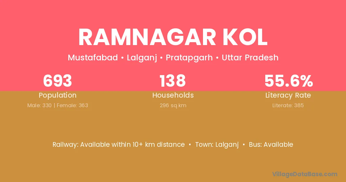 Ramnagar Kol village has a total population of 693 people, of which 330 are males and 363 are females.