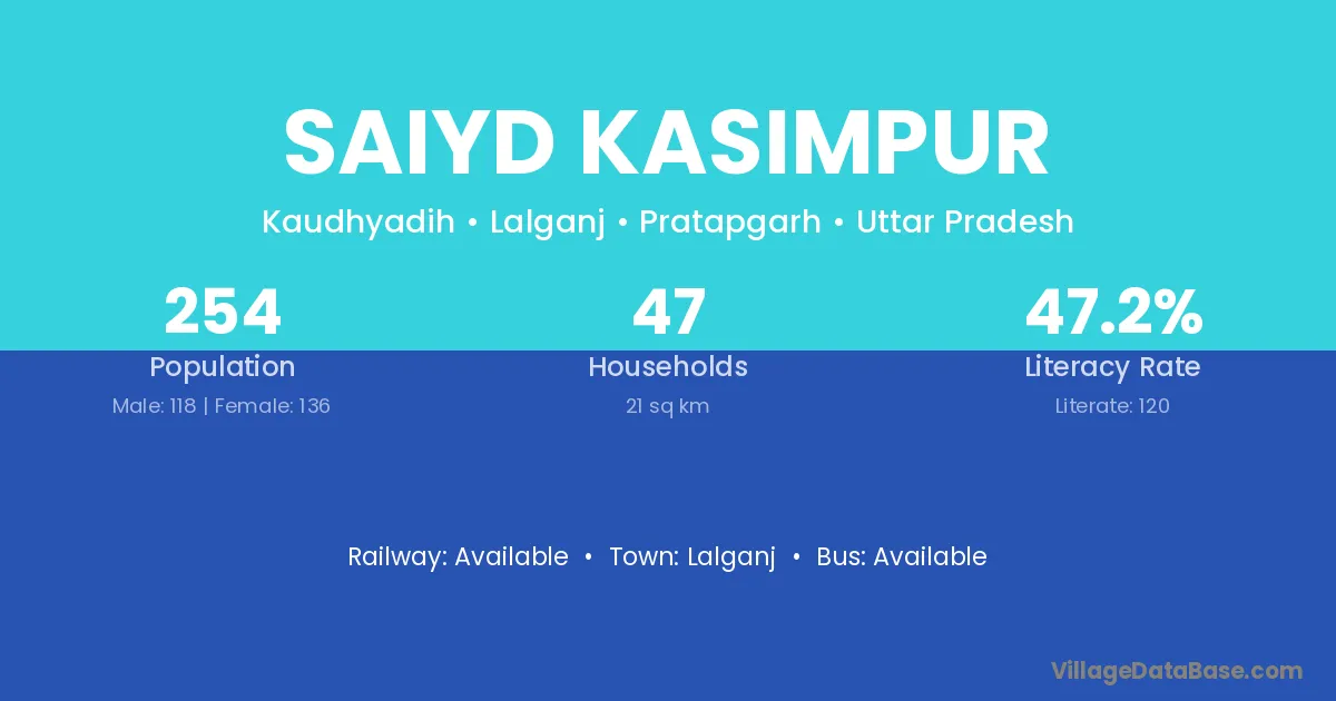 The literacy rate of Saiyd Kasimpur village is 47.24%. Male literacy stands at 50.85% and female literacy at 44.12%.