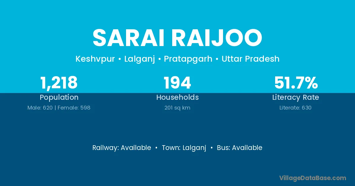Sarai Raijoo village has a total population of 1,218 people, of which 620 are males and 598 are females.
