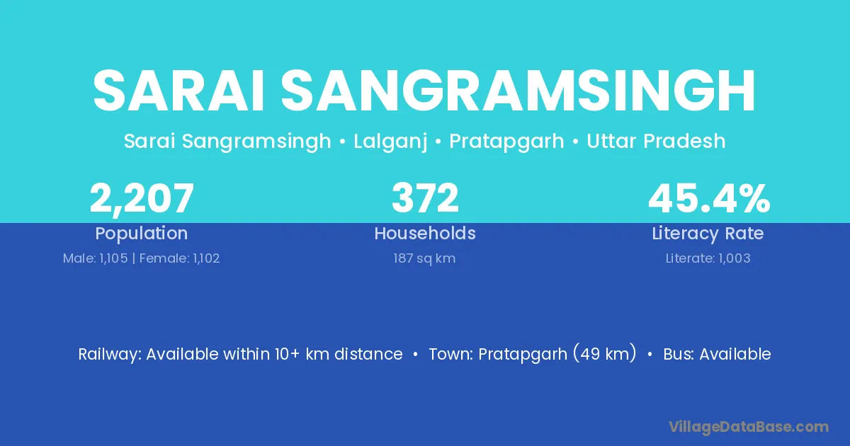 Pratapgarh (49 km) is the nearest town to Sarai Sangramsingh village for major economic activities and is located approximately 49 km away.