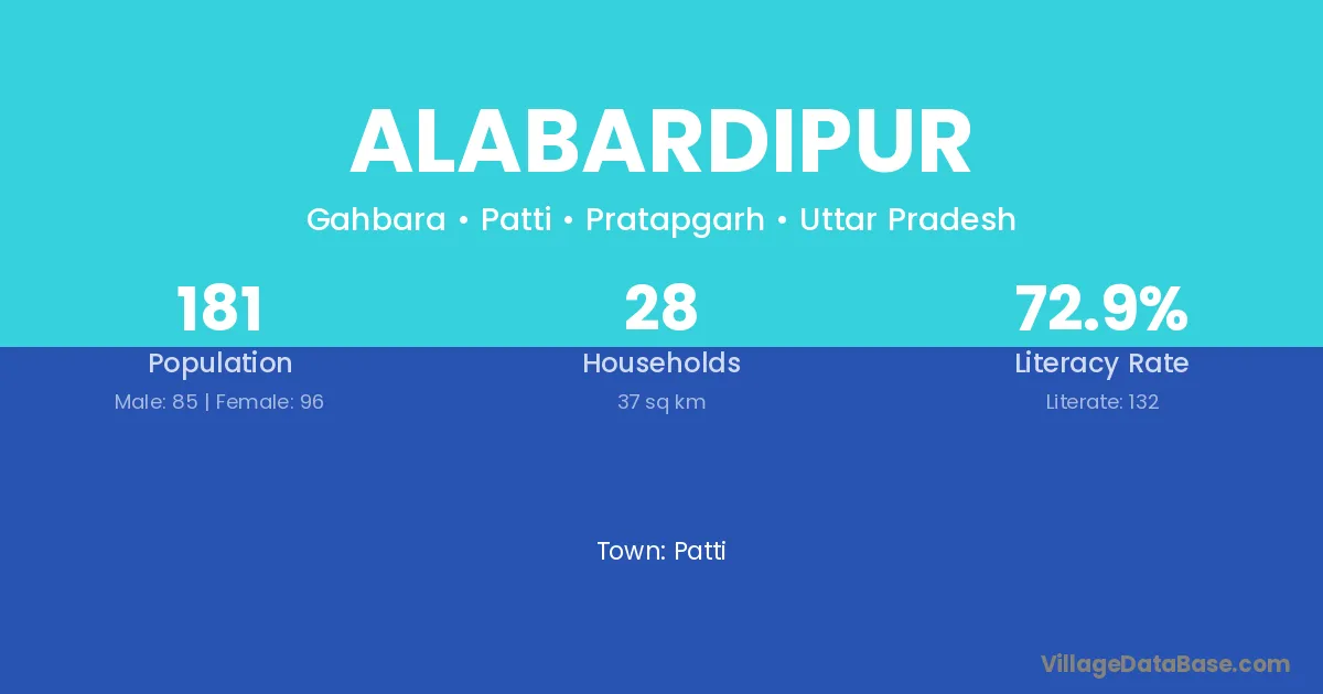 Alabardipur village has a total population of 181 people, of which 85 are males and 96 are females.