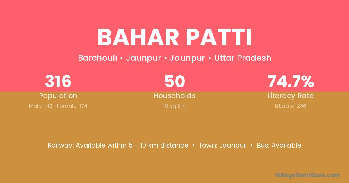 Patti (7 km) is the nearest town to Bahar Patti village for major economic activities and is located approximately 7 km away.