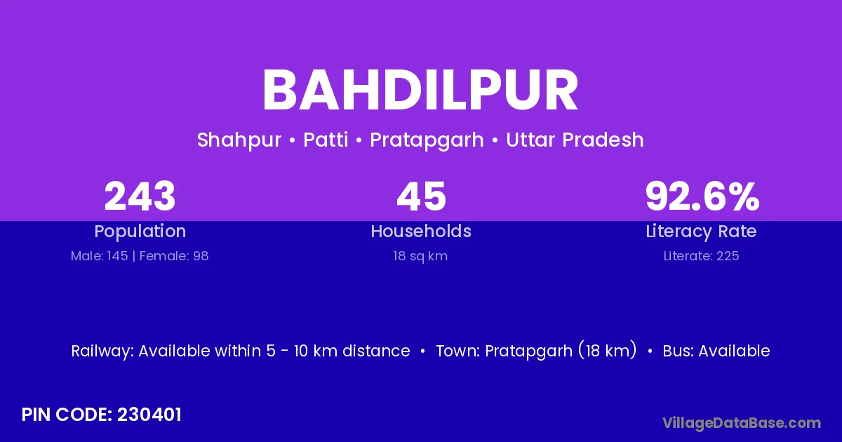 Pratapgarh (18 km) is the nearest town to Bahdilpur village for major economic activities and is located approximately 18 km away.