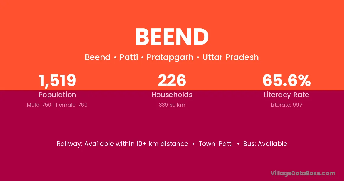 Beend village has a total population of 1,519 people, of which 750 are males and 769 are females.