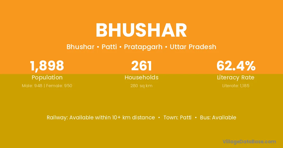 Bhushar village has a total population of 1,898 people, of which 948 are males and 950 are females.