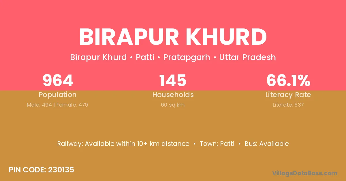 Birapur Khurd village has a total population of 964 people, of which 494 are males and 470 are females.