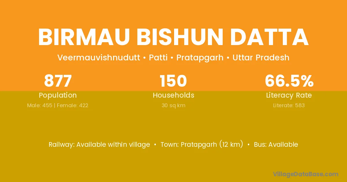 Pratapgarh (12 km) is the nearest town to Birmau Bishun Datta village for major economic activities and is located approximately 12 km away.
