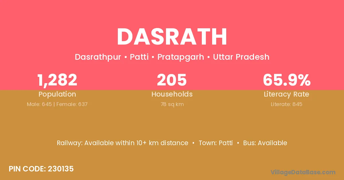 Dasrath village has a total population of 1,282 people, of which 645 are males and 637 are females.