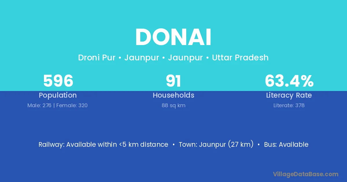 The literacy rate of Donai village is 64.99%. Male literacy stands at 68.13% and female literacy at 62.13%.